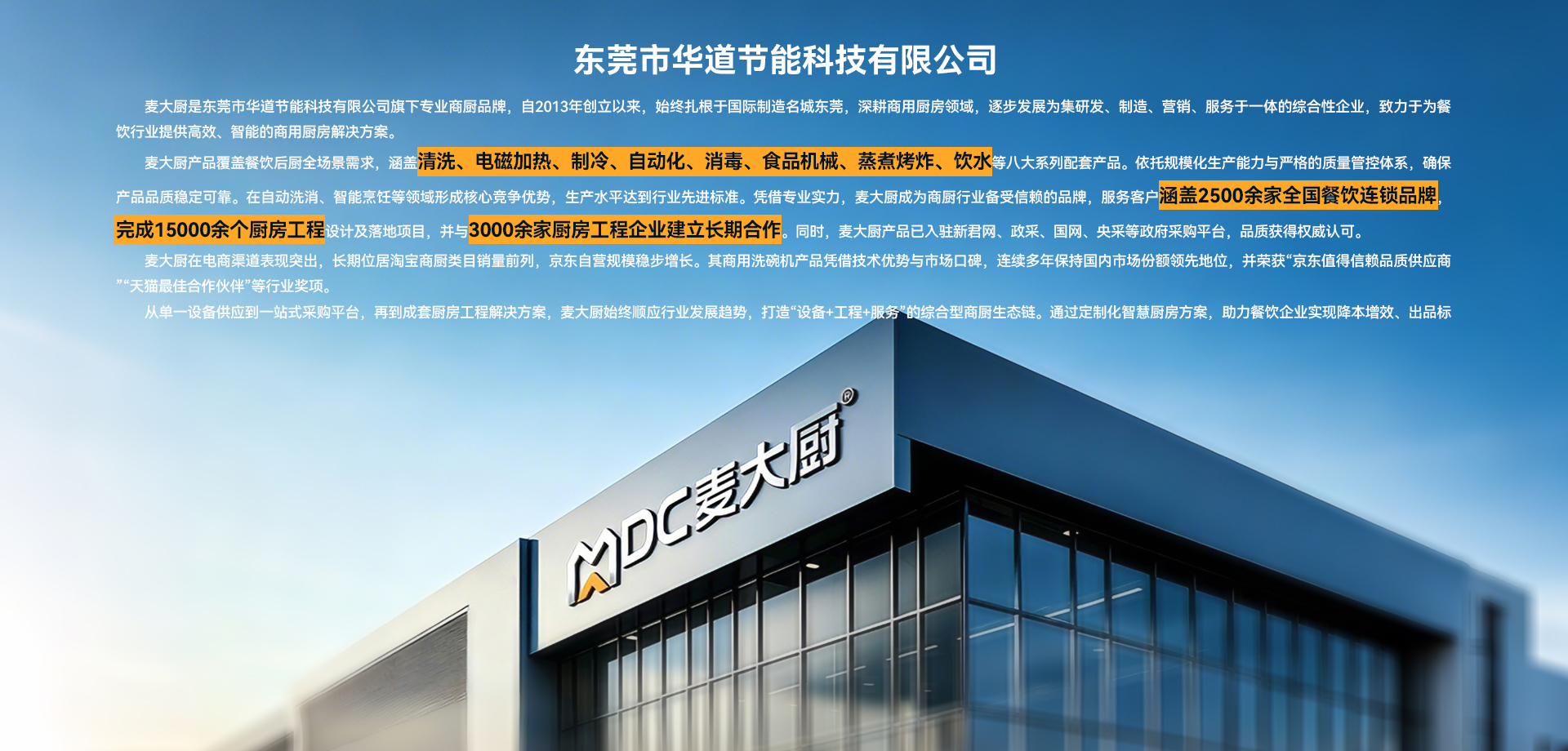 东莞市华道节能科技有限公司是国内最早涉足于商用厨房电器生产、销售、安装、售价服务的厂家,于2004年成立。 从创立之初即秉承着“拼技术、拼创新、拼质量、拼服务”的四拼原则,打破了行业“拼价格”市场风气,在市场白热化的竞争下,靠四拼精神取得了一定高端市场份额 并且带动一大批行业有理想的“匠心人”加入其中,共同打造行业的“中国质造”。